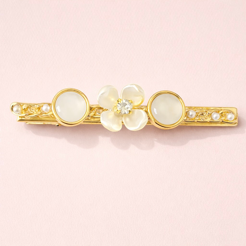 A gold-tone barrette with mother-of-pearl accents and subtle crystal detailing measuring approximately 3.1 inches, designed to add refined polish and soft structure to any hairstyle.