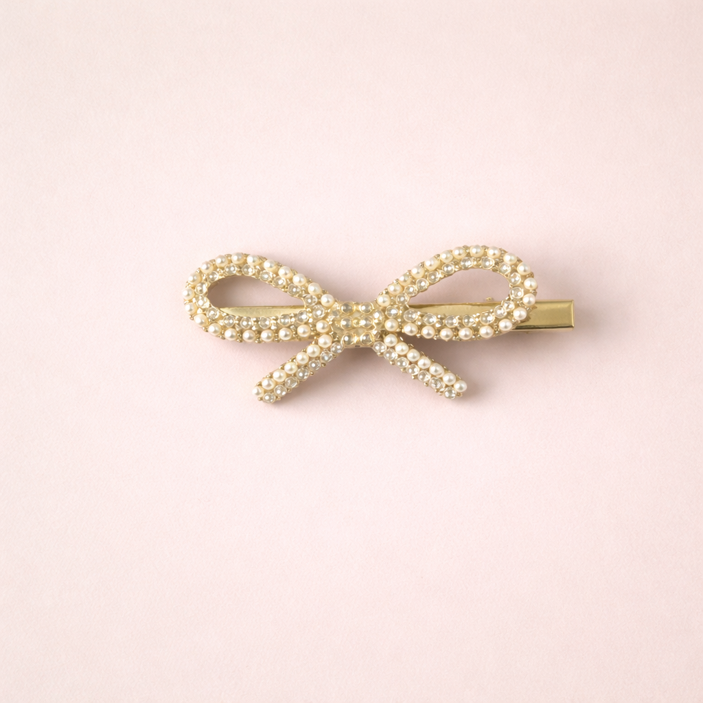 A luminous pearl-and-crystal bow clip measuring approximately 2.5 inches, designed to add refined sparkle and graceful structure to any hairstyle.