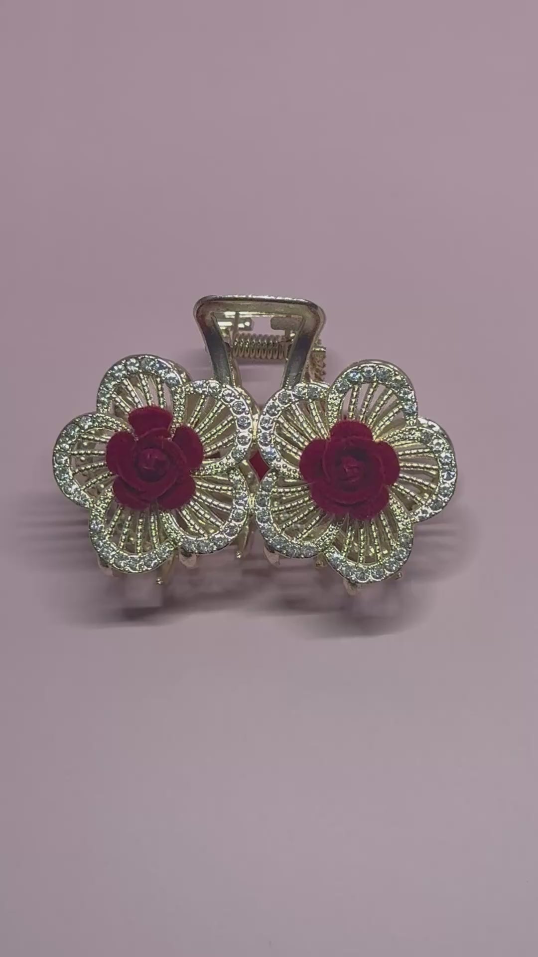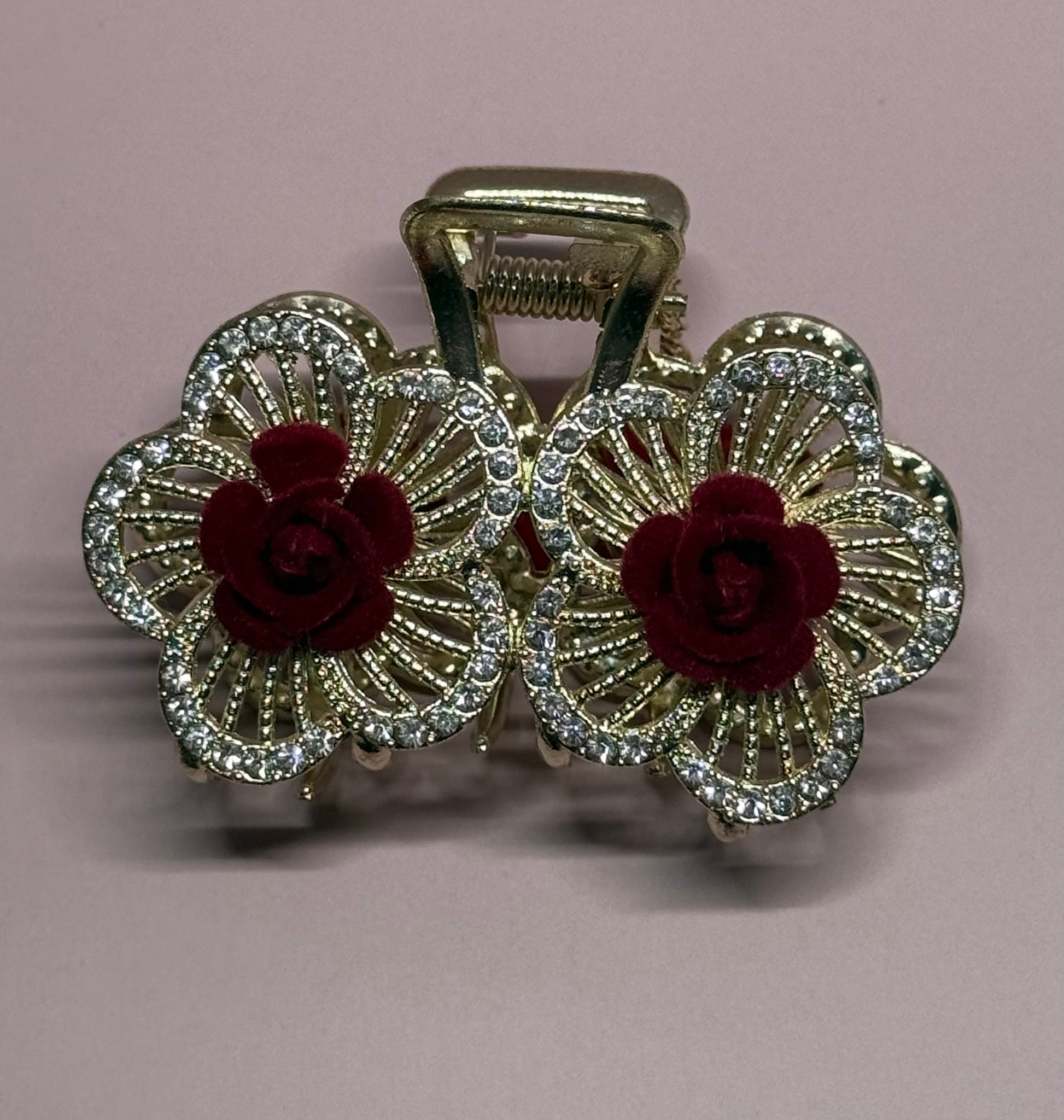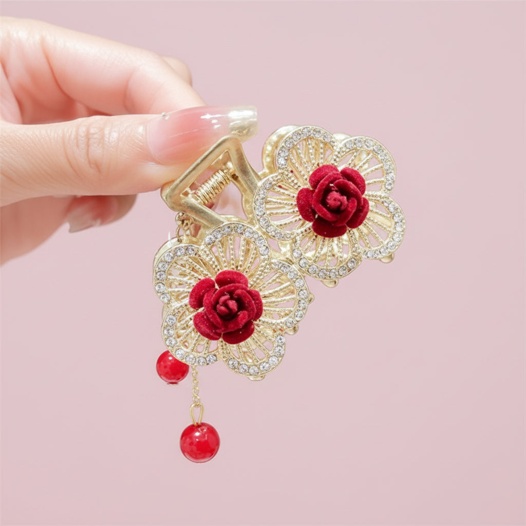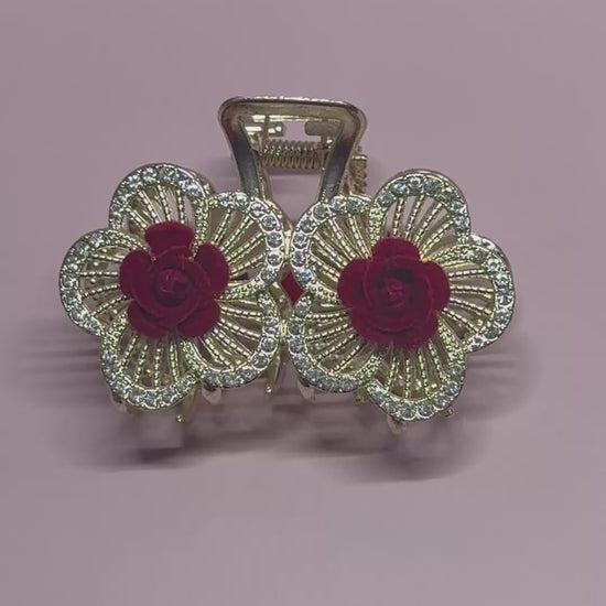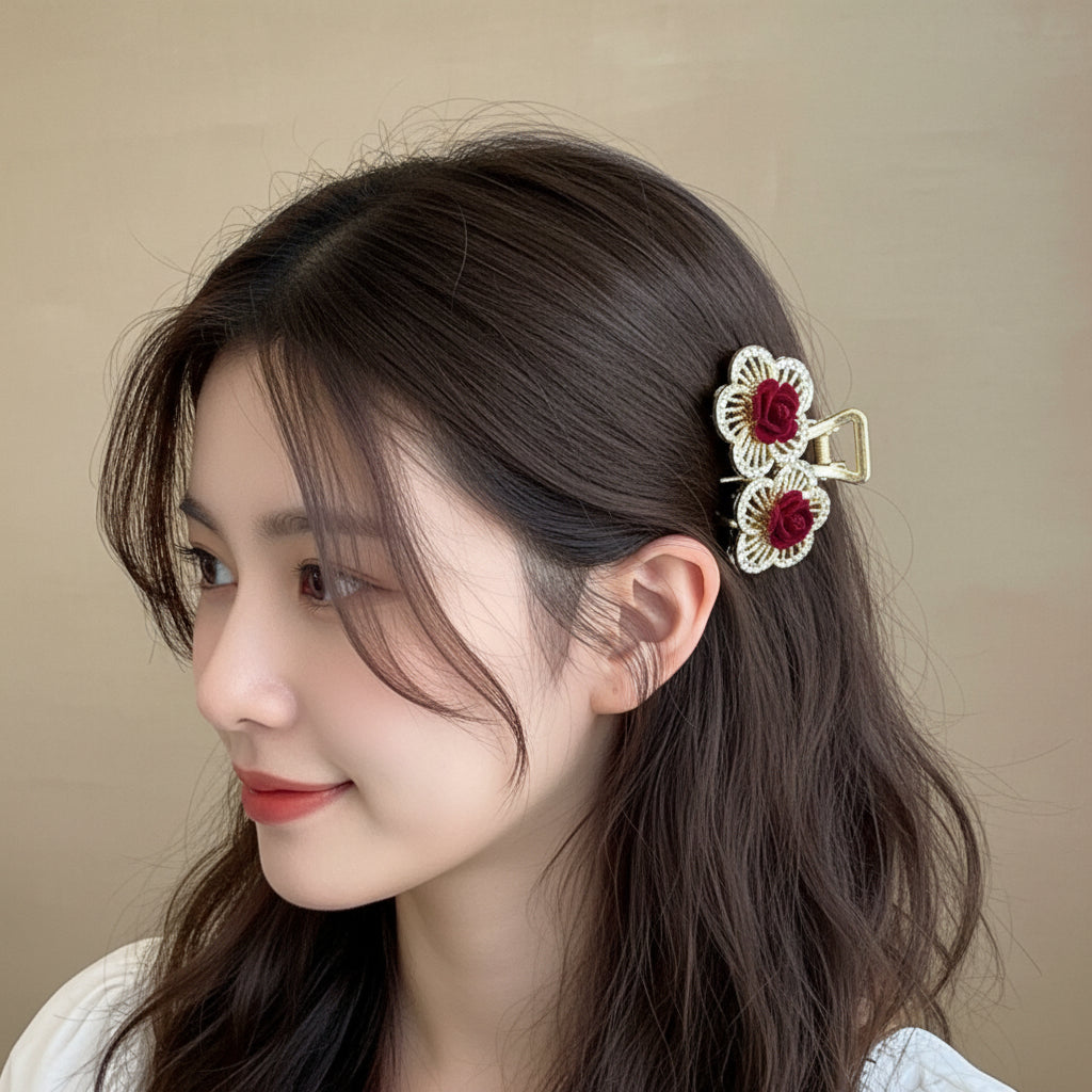 This double floral claw clip features delicate crystal-lined petals with rich crimson velvet rosettes at the center. Designed to add dimension and soft structure to your hairstyle, it offers a secure hold while elevating even the simplest look.
