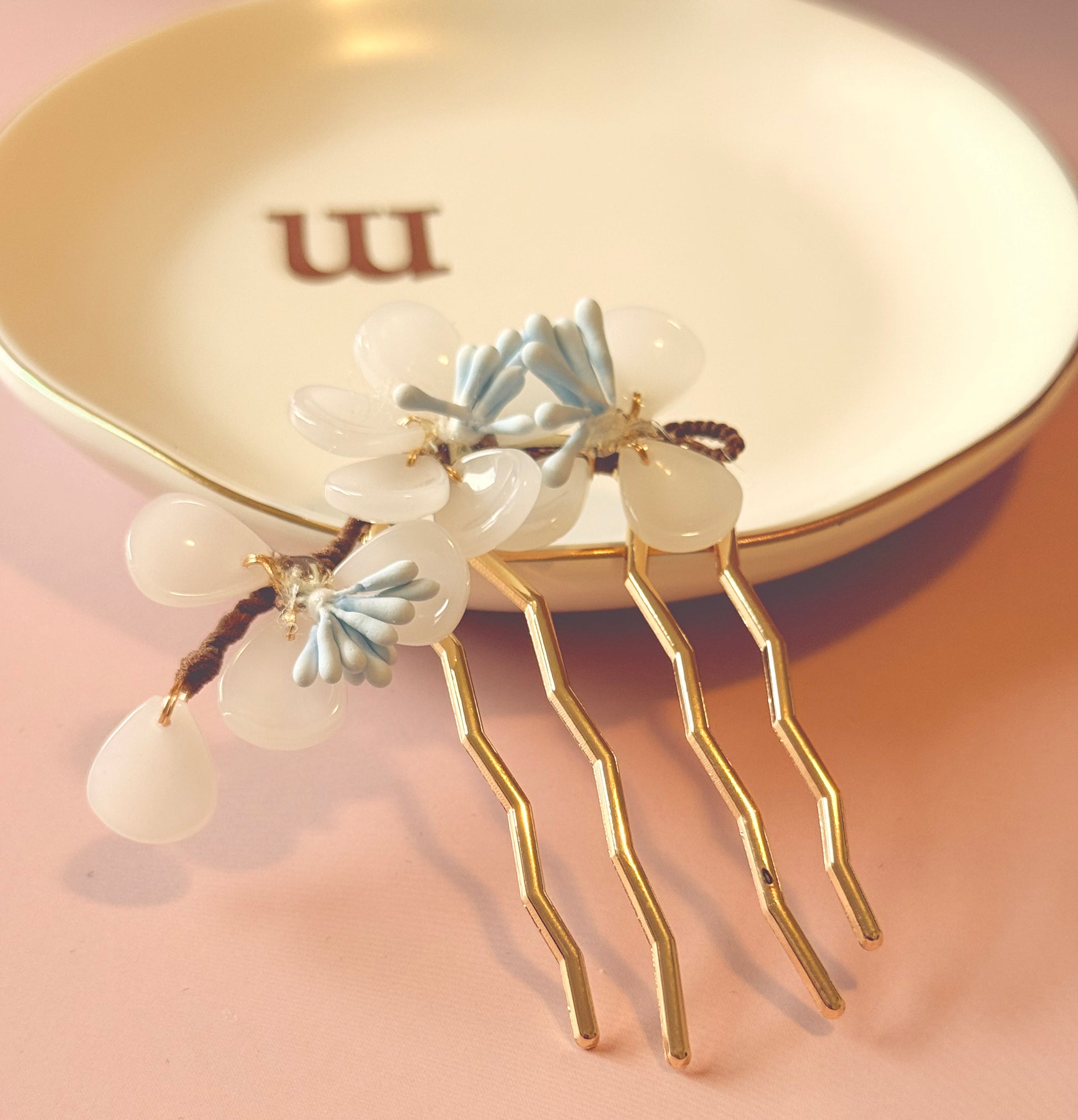 A sculpted floral cluster anchored in gold, finished with translucent petals and soft blue detailing. Designed to add structure and dimension to refined updos.